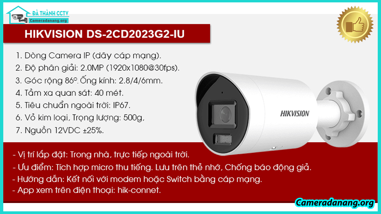 Nhu cầu sử dụng Lắp đặt camera Đà Nẵng để giám sát an ninh của khách hàng tại Đà Nẵng hiện nay ngày càng được nâng cao. Vì vậy sự ra đời của hàng loại thương hiệu cũng ra đời. Thương hiệu camera Hikvision cũng là một trong những thương hiệu lớn tự hào thiết kế nên nhiều dòng camera phục vụ tốt nhu cầu sử dụng của khách hàng. Hôm nay cùng ĐÀ THÀNH CCTV tìm hiểu về một mẫu Camera IP Hikvision ngoài trời cố định DS-2CD2023G2-IU đang được khách hàng cực kỳ ưa chuộng hiện nay.