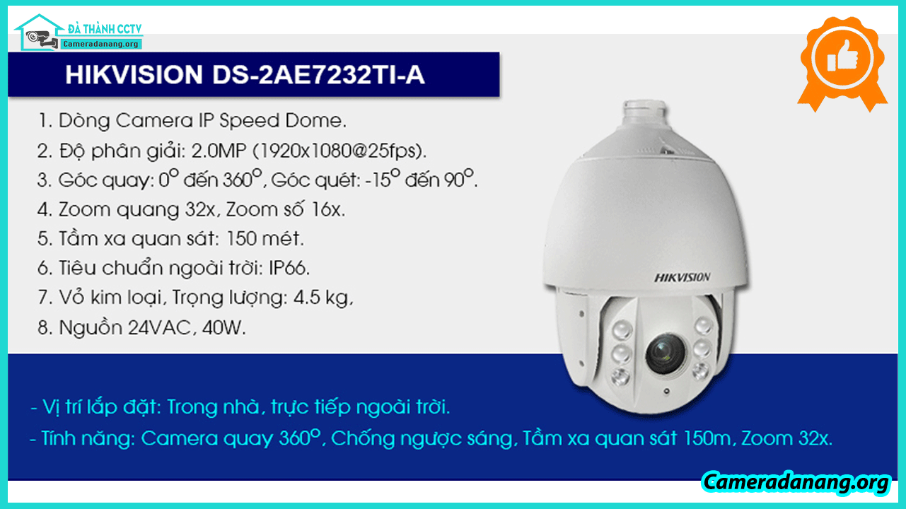 DS-2AE7232TI-A có độ phân giải cao, hỗ trợ chế độ quan sát ngày và đêm, chống ngược sáng, và khả năng chịu nước và bụi (IP66). Nó cũng được trang bị công nghệ hồng ngoại thông minh để cung cấp hình ảnh rõ ràng trong điều kiện ánh sáng yếu. Camera này cũng đi kèm với các tính năng bổ sung như chế độ quét tự động, chế độ hỗ trợ hồng ngoại thông minh (Smart IR), và khả năng quay 360 độ. Nó được sử dụng rộng rãi trong các ứng dụng giám sát an ninh, bảo vệ tài sản và quản lý an ninh công cộng, như trung tâm mua sắm, sân bay, bệnh viện và khu công nghiệp.
