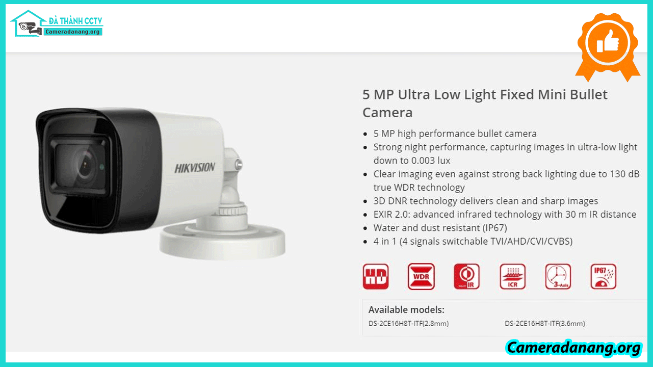 DS-2CE16H8T-ITF lắp đặt dễ dàng ở mọi vị trí mà không sợ bị ngược sáng, hình ảnh trong rõ và sáng hơn nhiều so với các camera thông thường khác và kích thước tối ưu nhỏ gọn.