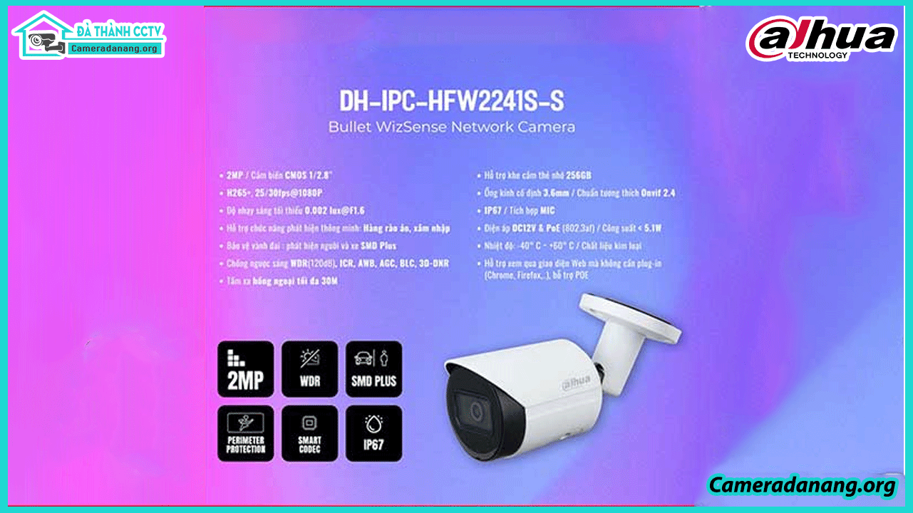 Camera IP Dahua ngoài trời cố định DH-IPC-HFW2241S-S là camera IP dòng WIZSENSE 2 ánh sáng kép thông minh, có độ phân giải 2.0 megapixel. Thiết kế nhỏ gọn, chắc chắc, hỗ trợ công nghệ Starlight. Hỗ trợ chống ngược sáng thực WDR(120dB) và chức năng phát hiện thông minh.
