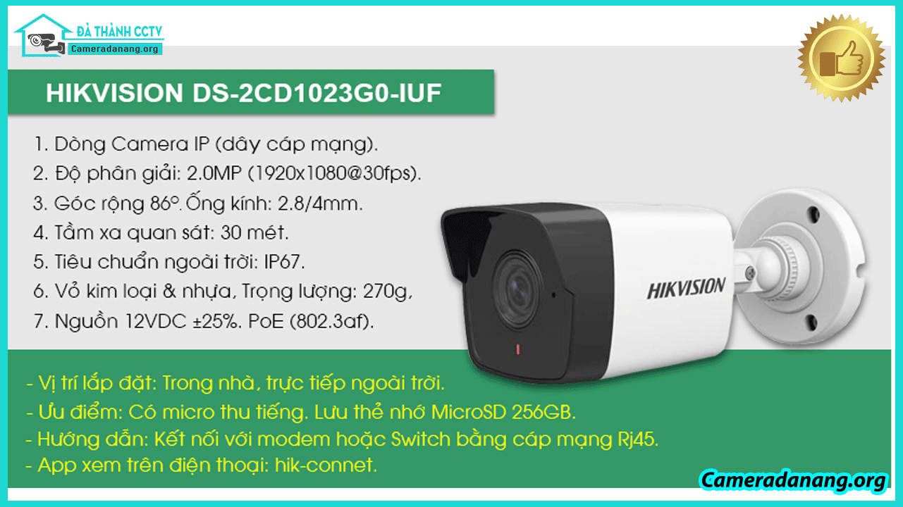 Nhu cầu sử dụng Lắp đặt camera Đà Nẵng để giám sát an ninh của khách hàng tại Đà Nẵng hiện nay ngày càng được nâng cao. Vì vậy sự ra đời của hàng loại thương hiệu cũng ra đời. Thương hiệu camera Hikvision cũng là một trong những thương hiệu lớn tự hào thiết kế nên nhiều dòng camera phục vụ tốt nhu cầu sử dụng của khách hàng. Hôm nay cùng ĐÀ THÀNH CCTV tìm hiểu về một mẫu Camera IP Hikvision ngoài trời cố định DS-2CD1023G0-IUF đang được khách hàng cực kỳ ưa chuộng hiện nay.