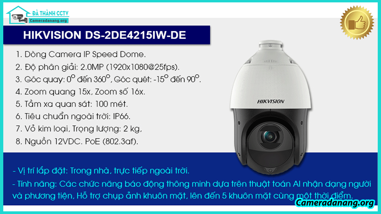 Nhu cầu sử dụng Lắp đặt camera Đà Nẵng để giám sát an ninh của khách hàng tại Đà Nẵng hiện nay ngày càng được nâng cao. Vì vậy sự ra đời của hàng loại thương hiệu cũng ra đời. Thương hiệu camera Hikvision cũng là một trong những thương hiệu lớn tự hào thiết kế nên nhiều dòng camera phục vụ tốt nhu cầu sử dụng của khách hàng. Hôm nay cùng ĐÀ THÀNH CCTV tìm hiểu về một mẫu Camera IP Hikvision quay quét ngoài trời DS-2DE4215IW-DE đang được khách hàng cực kỳ ưa chuộng hiện nay.