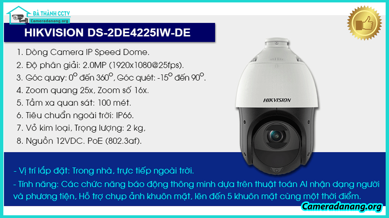 Nhu cầu sử dụng Lắp đặt camera Đà Nẵng để giám sát an ninh của khách hàng tại Đà Nẵng hiện nay ngày càng được nâng cao. Vì vậy sự ra đời của hàng loại thương hiệu cũng ra đời. Thương hiệu camera Hikvision cũng là một trong những thương hiệu lớn tự hào thiết kế nên nhiều dòng camera phục vụ tốt nhu cầu sử dụng của khách hàng. Hôm nay cùng ĐÀ THÀNH CCTV tìm hiểu về một mẫu Camera IP Hikvision quay quét ngoài trời DS-2DE4225IW-DE đang được khách hàng cực kỳ ưa chuộng hiện nay.