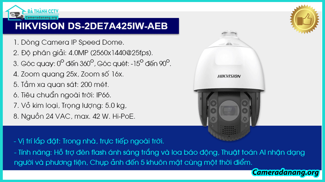 Nhu cầu sử dụng Lắp đặt camera Đà Nẵng để giám sát an ninh của khách hàng tại Đà Nẵng hiện nay ngày càng được nâng cao. Vì vậy sự ra đời của hàng loại thương hiệu cũng ra đời. Thương hiệu camera Hikvision cũng là một trong những thương hiệu lớn tự hào thiết kế nên nhiều dòng camera phục vụ tốt nhu cầu sử dụng của khách hàng. Hôm nay cùng ĐÀ THÀNH CCTV tìm hiểu về một mẫu Camera IP Hikvision ngoài trời xoay 360 DS-2DE7A425IW-AEB đang được khách hàng cực kỳ ưa chuộng hiện nay.
