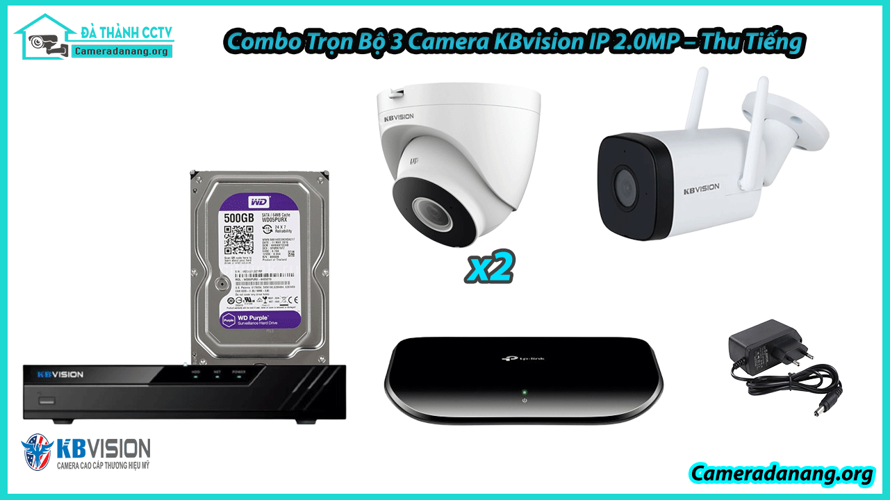 Combo Trọn Bộ 3 Camera KBvision IP 2.0MP – Thu Tiếng – Có Màu bao gồm: