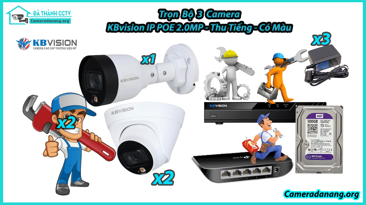 Combo Trọn Bộ 3 Camera KBvision IP POE 2.0MP – Thu Tiếng – Có Màu bao gồm:
